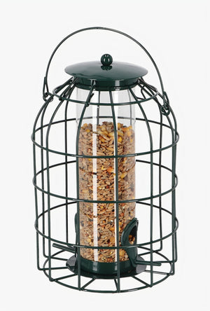 Om te voorkomen dat kraaien of eekhoorns bij het voer komen, bevindt deze voersilo zich in een speciale houder, Kleine vogels zoals mezen kunnen moeiteloos door het gaas heen reiken om bij het voer te komen. Deze voersilo houdt het strooivoer droog en beschermd tegen regen.De twee openingen in de silo zorgen voor een afgemeten hoeveelheid voer. Door het deksel aan de bovenzide omhoog te trekken, is deze voersilo eenvoudig biji te vullen.